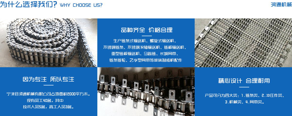 生產(chǎn)鏈條式輸送機(jī)、螺旋式輸送機(jī)、不銹鋼鏈條、不銹鋼滾軸輸送機(jī)、鏈板輸送機(jī)、重型鏈板輸送機(jī)、馬蹄鏈、長(zhǎng)城網(wǎng)帶、鏈條鏈輪、乙字型網(wǎng)帶等玻璃制瓶機(jī)配件,食品機(jī)械配件及各種網(wǎng)帶的專業(yè)廠家 ,多年來(lái)產(chǎn)品暢銷各地玻璃廠和食品廠,在玻璃制品等行業(yè)中享有較高的聲譽(yù)。公司集摸具開(kāi)發(fā)、機(jī)械設(shè)計(jì)生產(chǎn),銷售于一體的生產(chǎn)型企業(yè)。生產(chǎn)的自動(dòng)化流水線金屬傳動(dòng)網(wǎng)帶、鏈條等產(chǎn)品廣泛用于玻璃機(jī)械、食品機(jī)械、化纖機(jī)械、醫(yī)藥、電子、烘干機(jī)械、輪胎機(jī)械等行業(yè)。產(chǎn)品多銷往各個(gè)城市的機(jī)械廠、食品廠和一些涉及流水線或自動(dòng)化設(shè)備的公司。